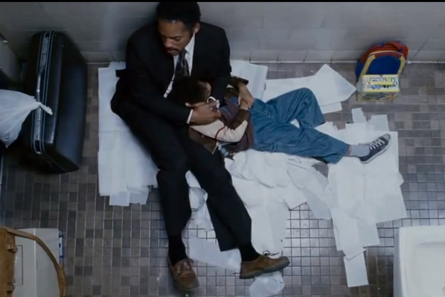 하지만 이때까지도 잘 팔리지 않던 스캐너는 잘 팔릴 일이 없다. 땡전한푼 없는 그는 집도 없어 매일 퇴근하고 노숙자에게 잠자리를 제공하는 곳에 달려가 줄을 서서 아들과 함께 자고, 지하철 역 화장실에서 노숙도 하며 빛이 없는 곳에서 달빛으로 공부를 하며 6개월을 버틴다.