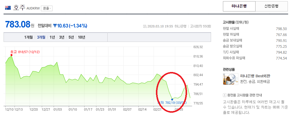 2018년 700원대까지 떨어지고 다시 조금씩 치고 올라가서 800원 근방을 근근하고 있던 호주 환율이 다시 780원, 770원대로 떨어졌습니다. 이는 11년만의 최저라고 합니다. 호주의 주식도 어제 기준으로 폭락했다고 합니다.